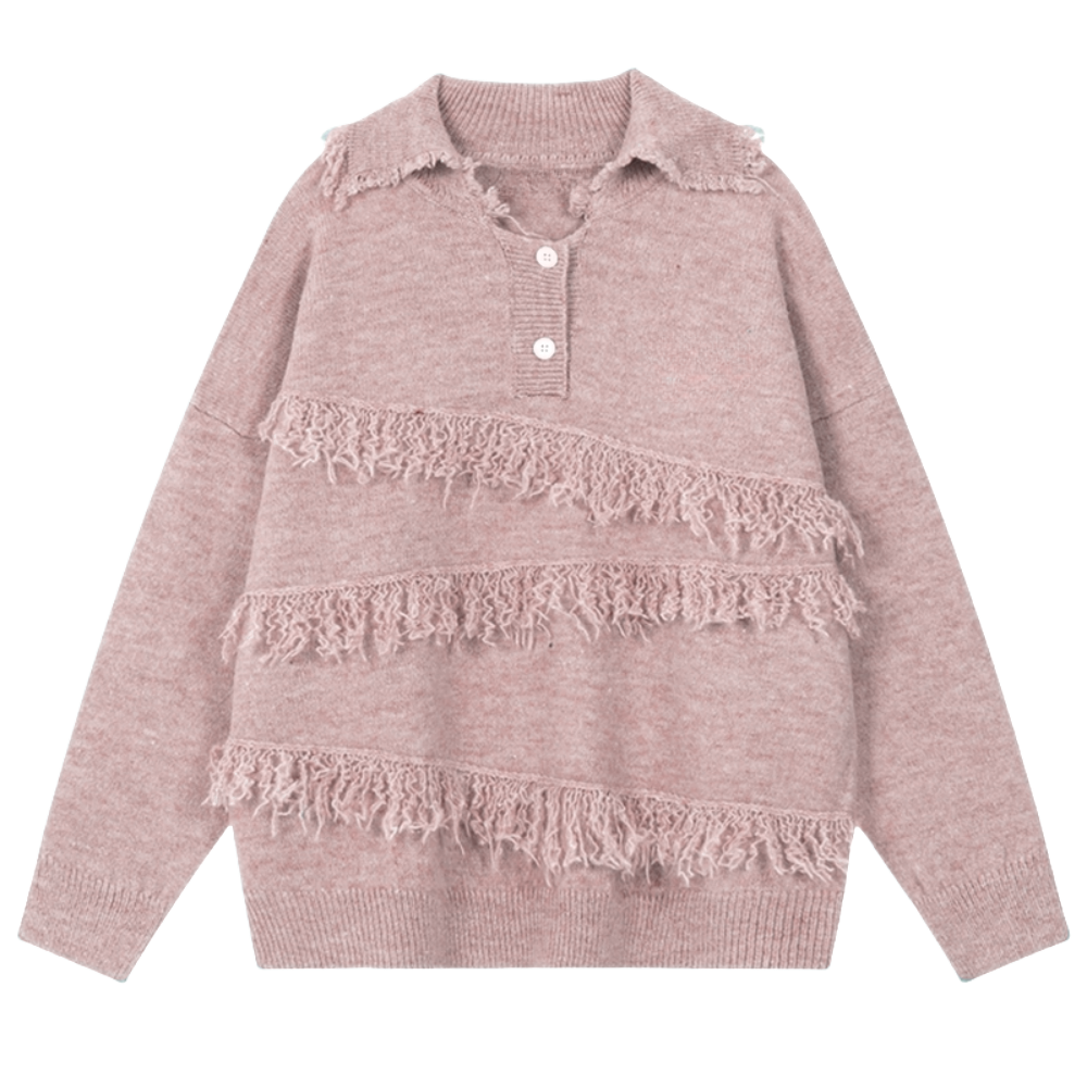 Made from premium, soft-knit fabric, this sweater features a retro-inspired collared design accented with playful fringes for a touch of individuality.